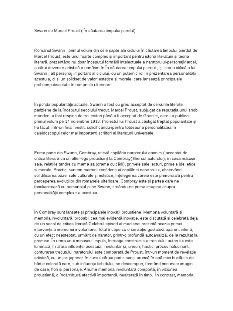 Romanul Swann Primul Volum Din Cele șapte Ale Ciclului In Căutarea Timpului Pierdut De Marcel Proust Este Unul Foarte Complex și I
